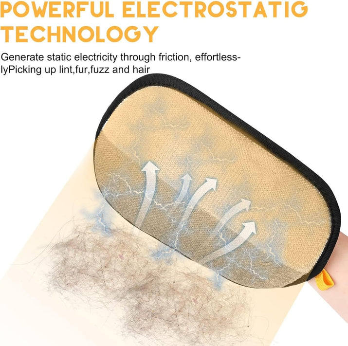 Answer 1: The gloves feature a specially designed textured surface that generates static electricity, allowing them to attract and lift pet hair, dander, and lint from various surfaces with just a simple stroke.